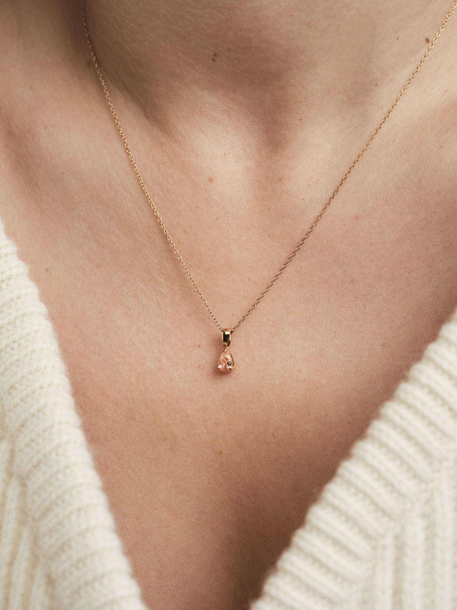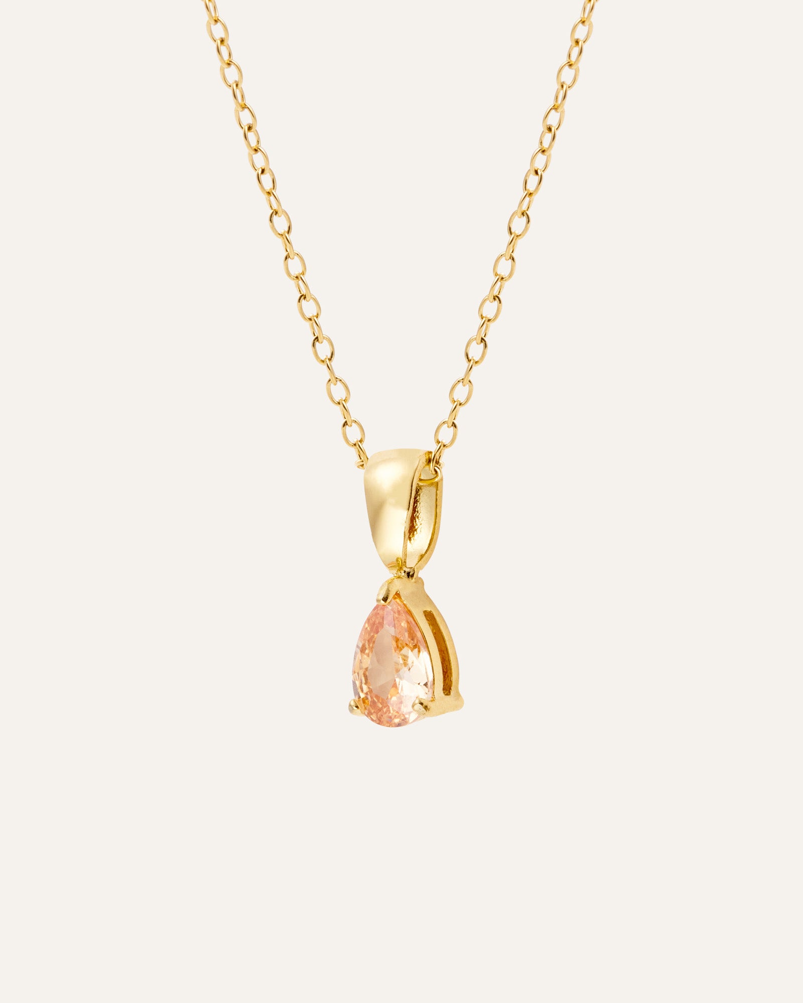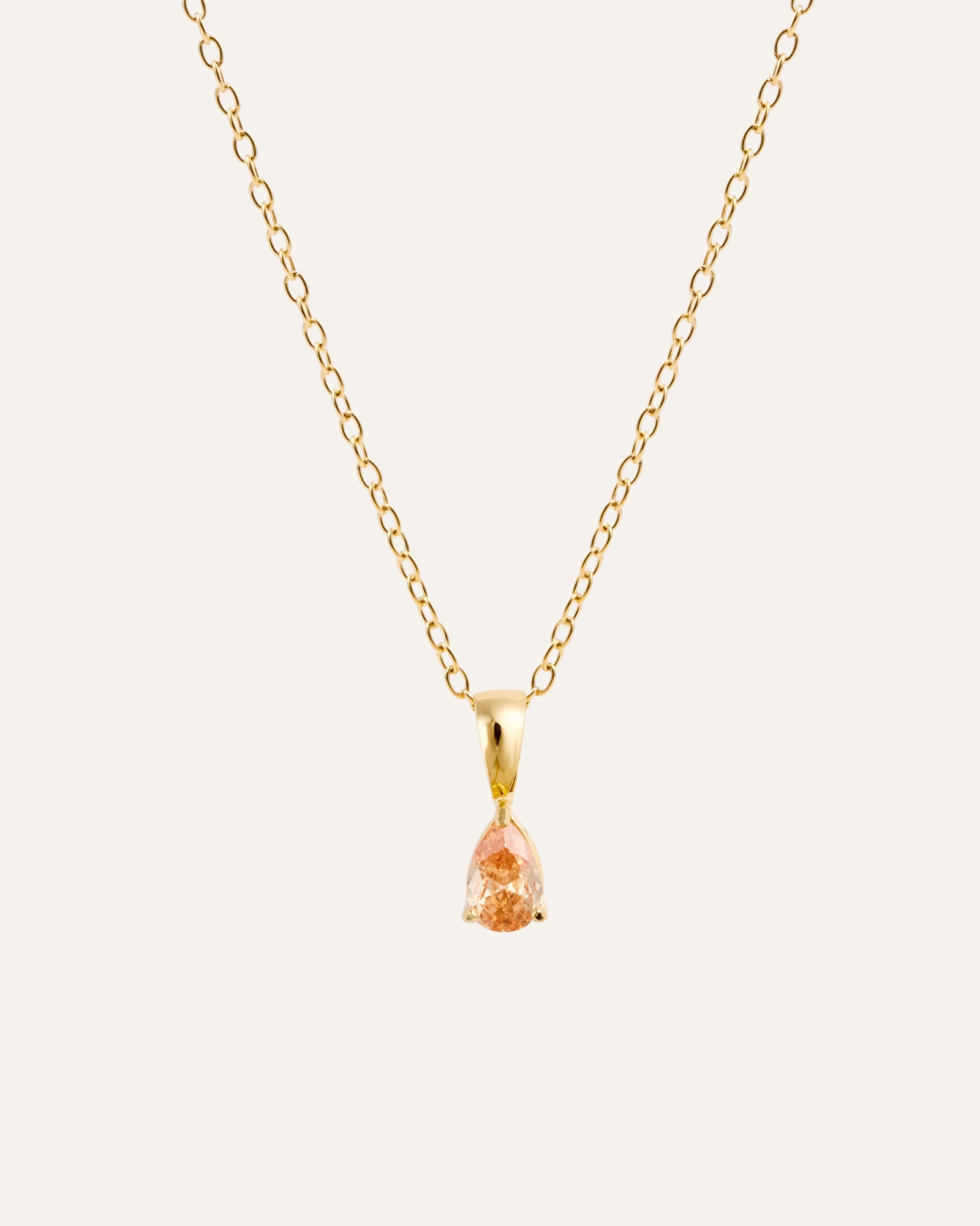 Belle Champagne Necklace är ett minimalistiskt halsband med en droppformad champagne-färgad sten fäst i en tunn kedja. Tillverkat i rostfritt stål med 18K guld PVD-plätering är det både slitstarkt och vattentåligt, vilket gör att det behåller sin färg och glans över tid.