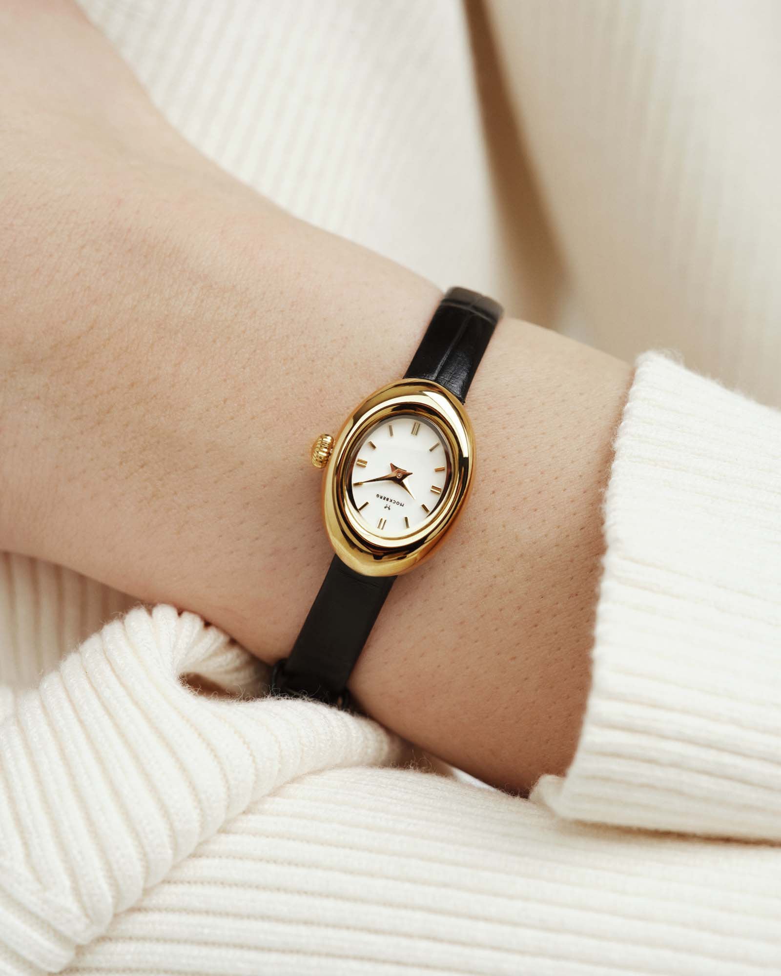 Belle Oval Leather Watch i en mindre design. Denna klocka har ett stilrent svart läderarmband och en mjukt rundad oval boett som kombineras med klassiskt läderband för en tidlös look.