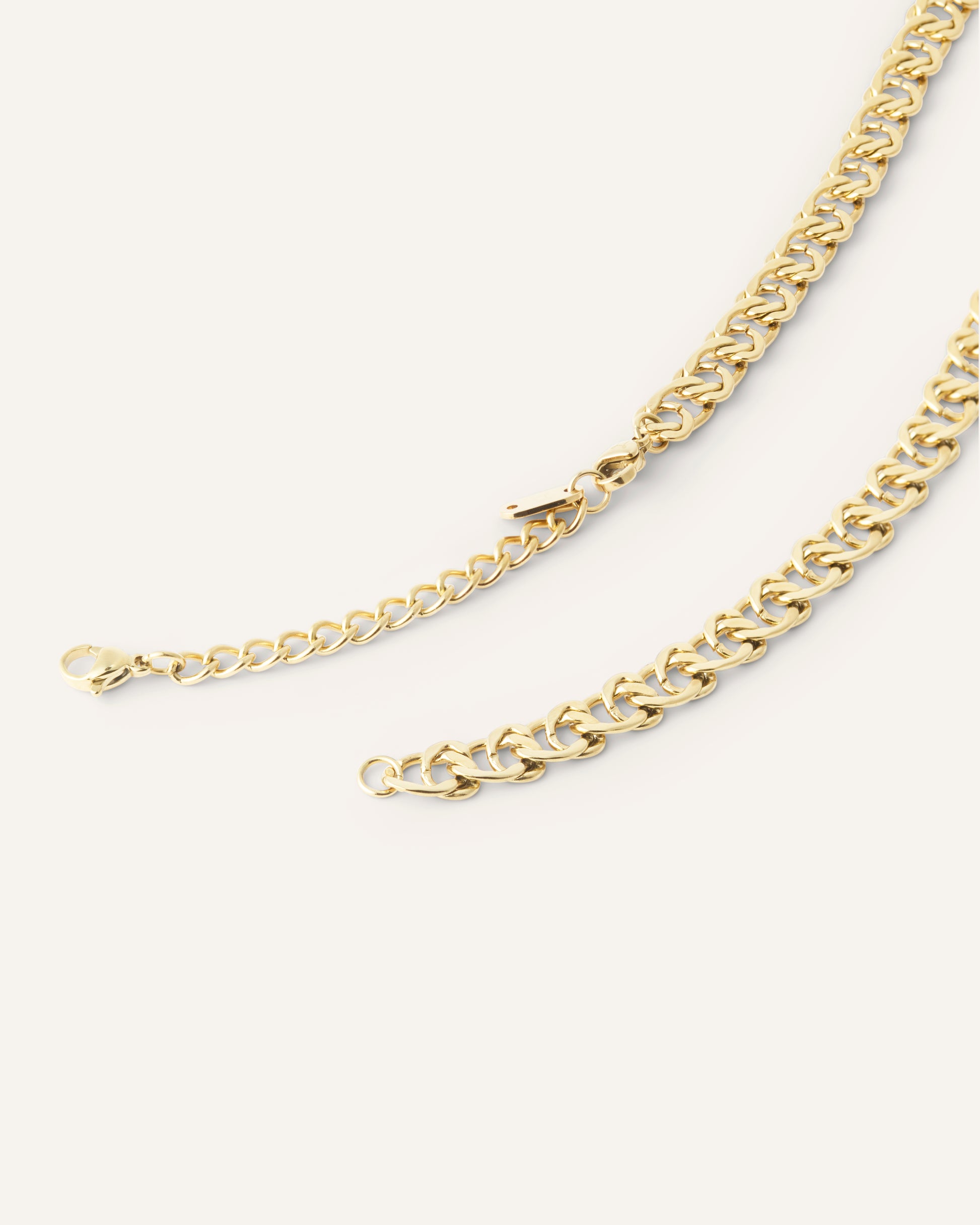Mer kedja, samma rena uttryck. Infinity Necklace i en bredare curb chain ger ett tydligt, harmoniskt intryck runt halsen. Tillverkat i rostfritt stål med 18K guldfärgad PVD-plätering som står emot vardagens slitage och behåller sin glans. Vattentåligt och enkelt att anpassa – förlängningskedjan kan tas av för en perfekt passform.