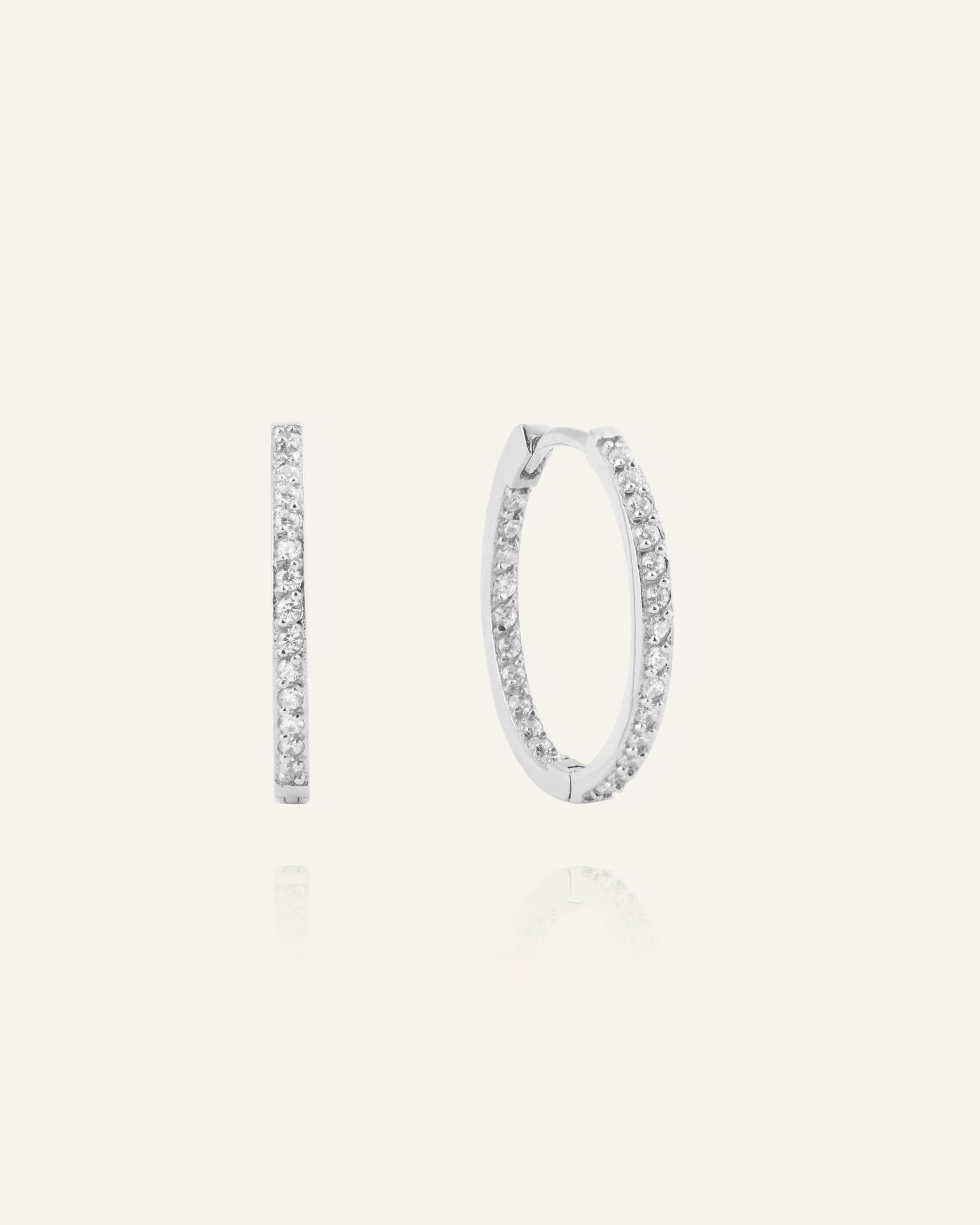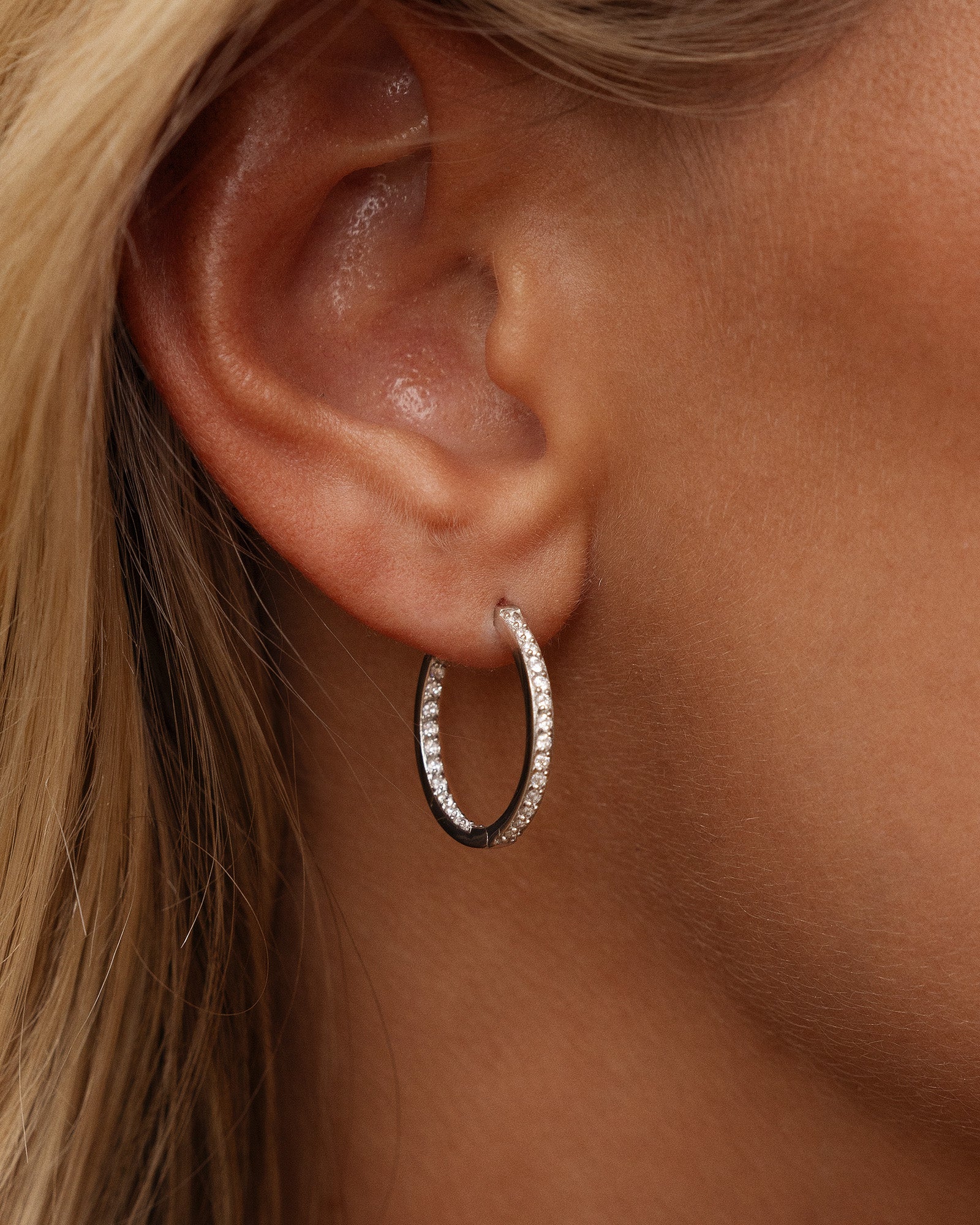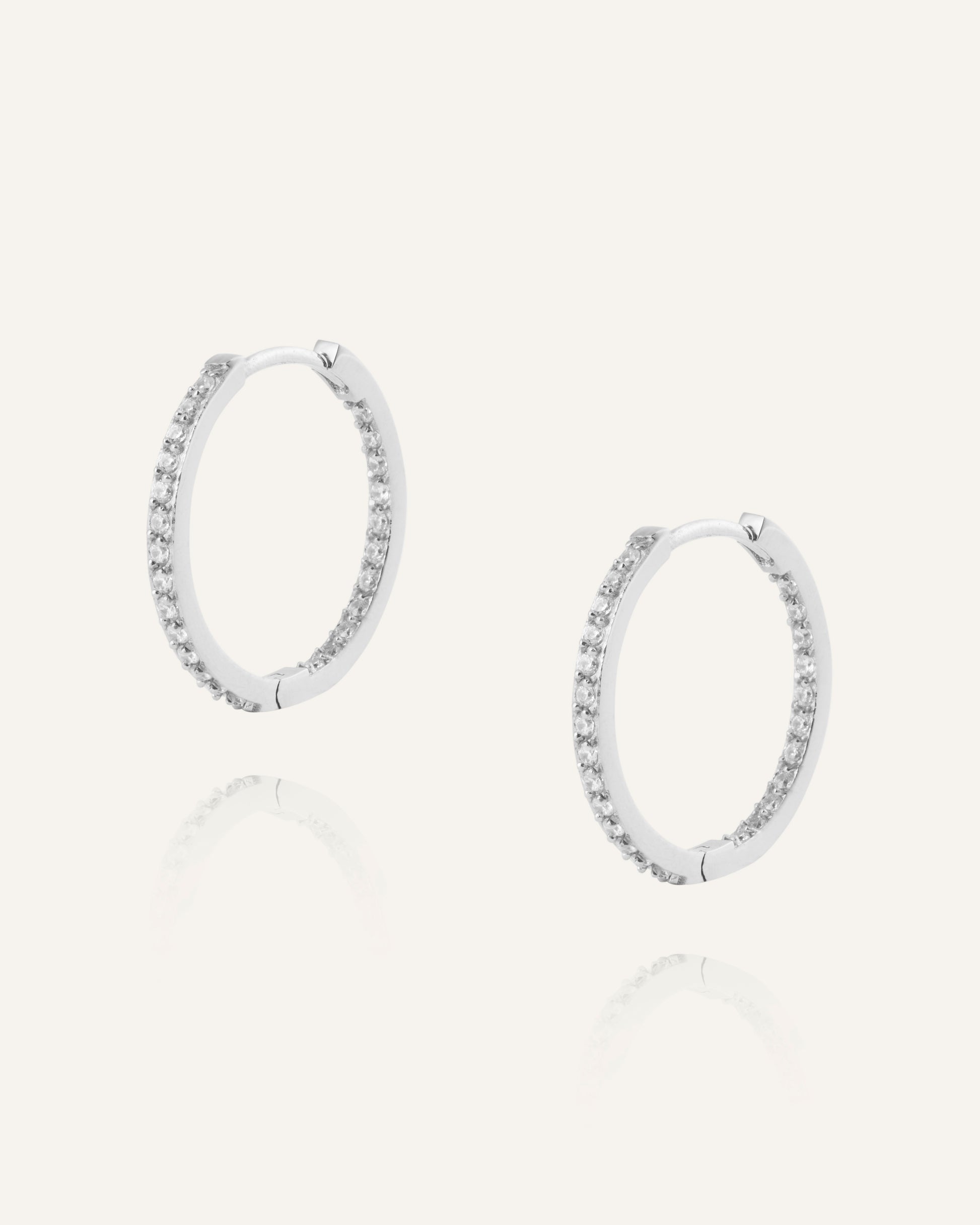 Sparkle Hoops glimmar mjukt i silverfärgad ton. De smala creolerna pryds av Cubic Zirconia som fångar ljuset vid varje rörelse. Lätta att bära, lätta att matcha – från vardag till kväll.