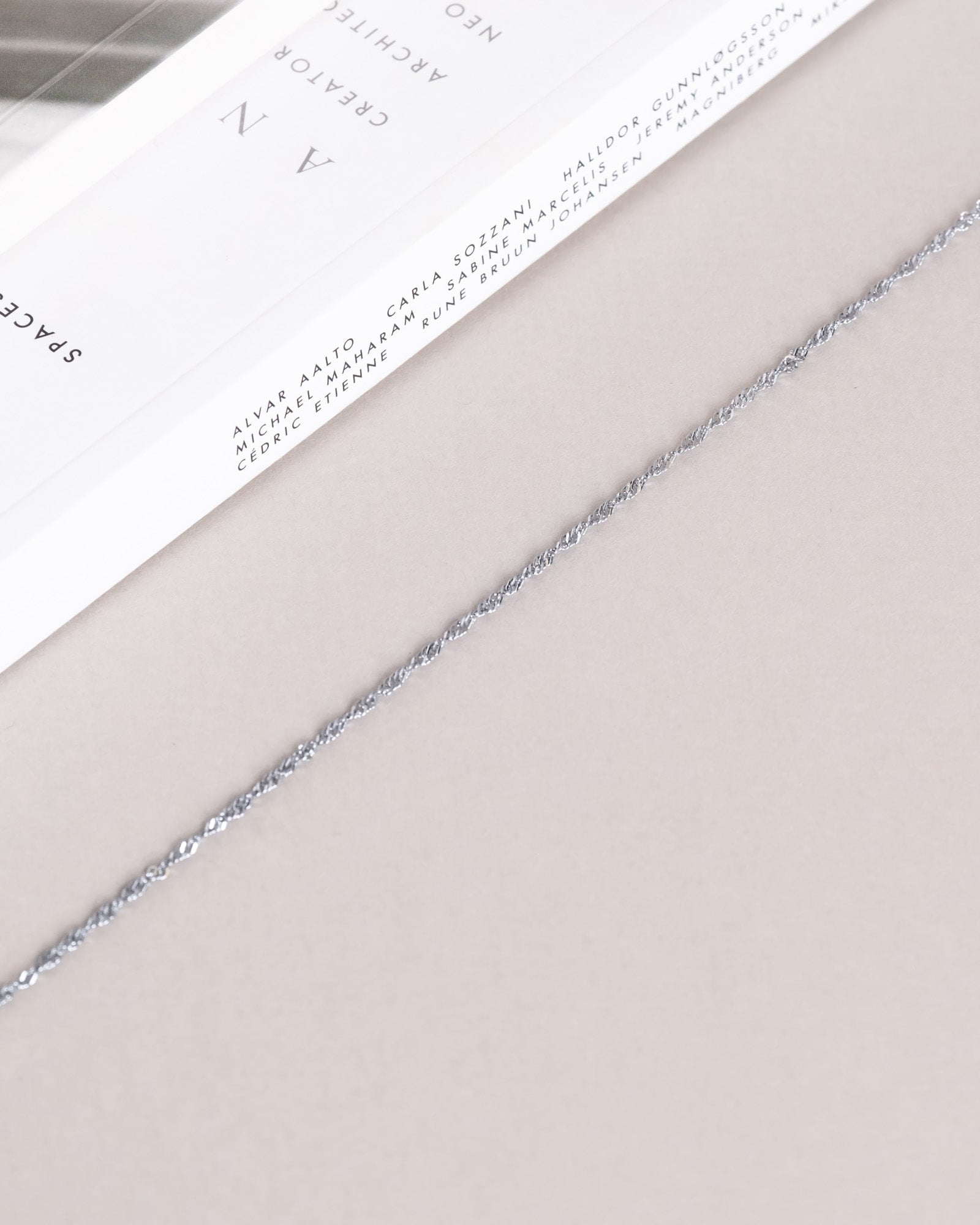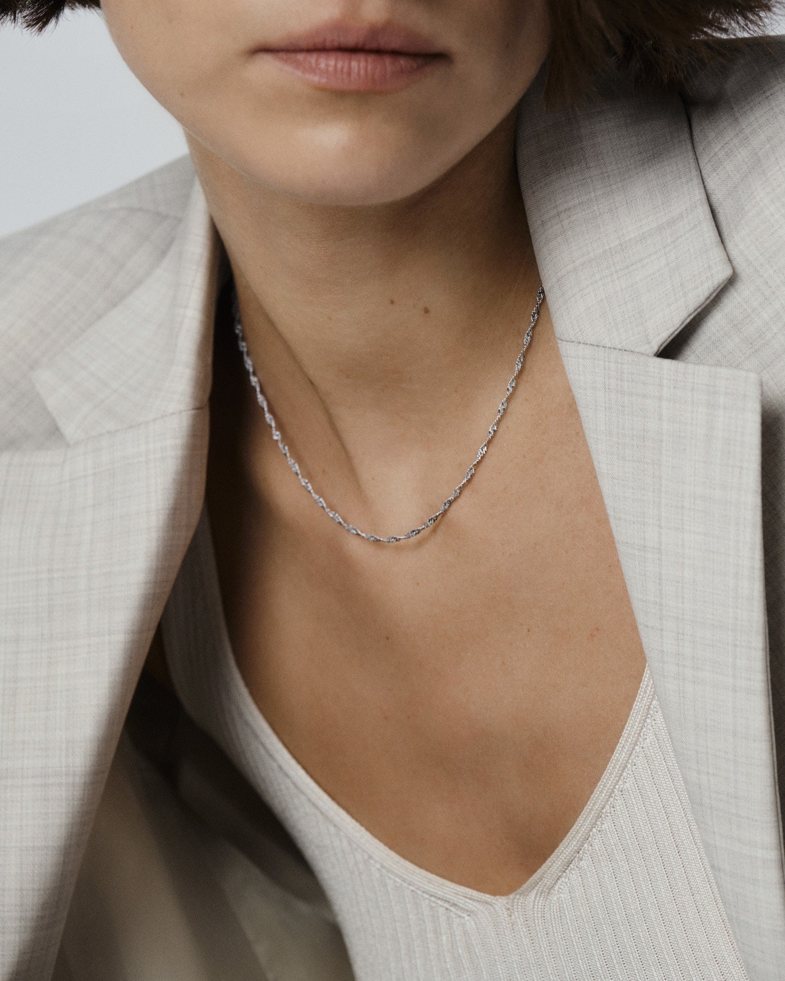 Twirl Necklace är ett halsband med en tunn, tvinnad kedja. Perfekt att bära för sig själv eller kombinera i lager med andra halsband. Tillverkat i rostfritt stål med PVD-plätering är det både slitstarkt och vattentåligt, vilket gör att det behåller sin färg och glans över tid. Förlängningskedjan kan enkelt tas av för en anpassad passform.