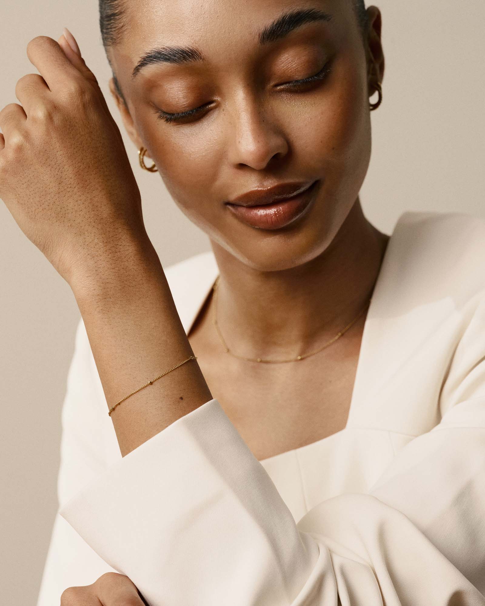 Pärlarmbandet har en mjuk, taktil kvalitet som gör det till en fröjd att bära, släta runda länkar som fångar ljuset utan att någonsin kännas för mycket. En stilla favorit som är lika vacker ensam som matchad med andra armband.