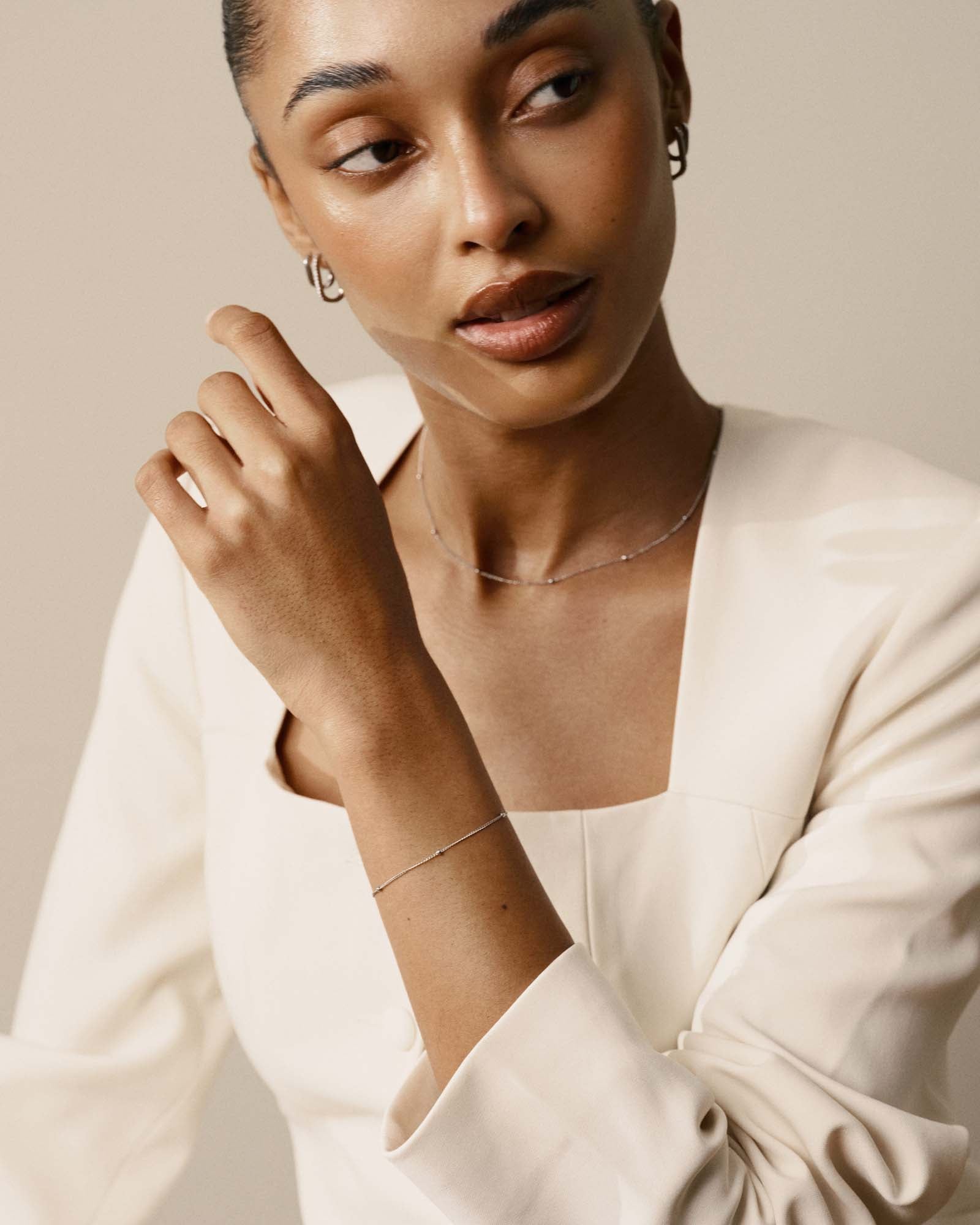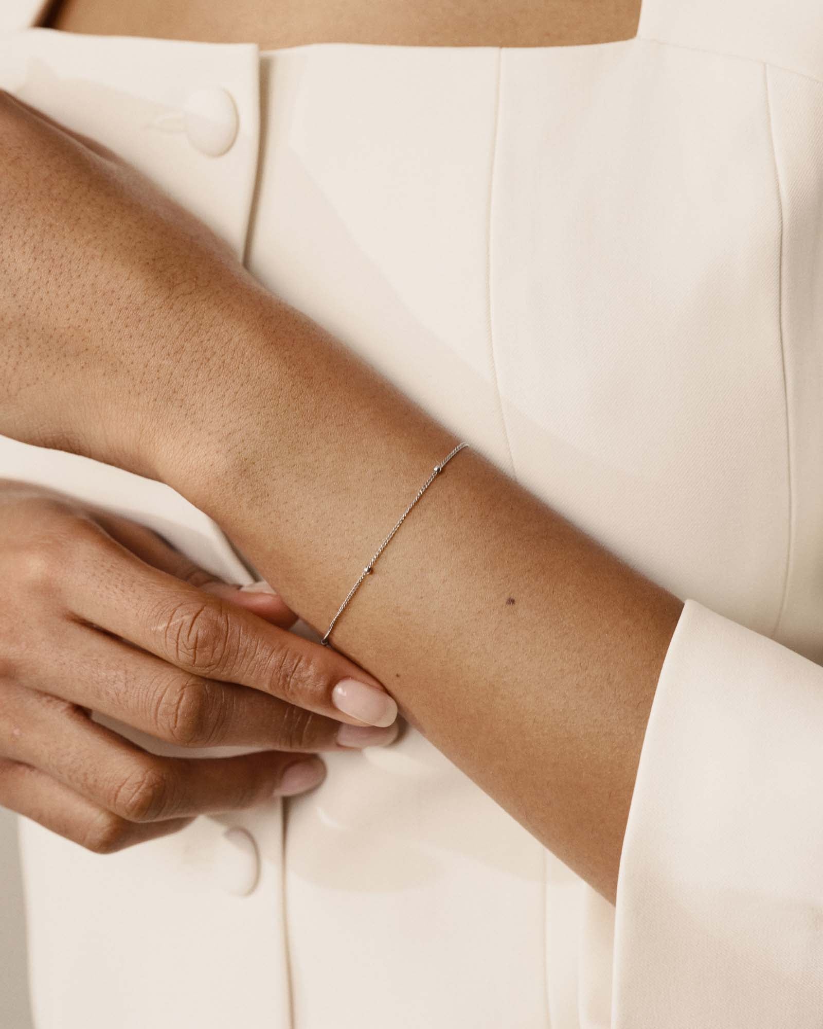 Pärlarmbandet har en mjuk, taktil kvalitet som gör det till en fröjd att bära, släta runda länkar som fångar ljuset utan att någonsin kännas för mycket. En stilla favorit som är lika vacker ensam som matchad med andra armband.
