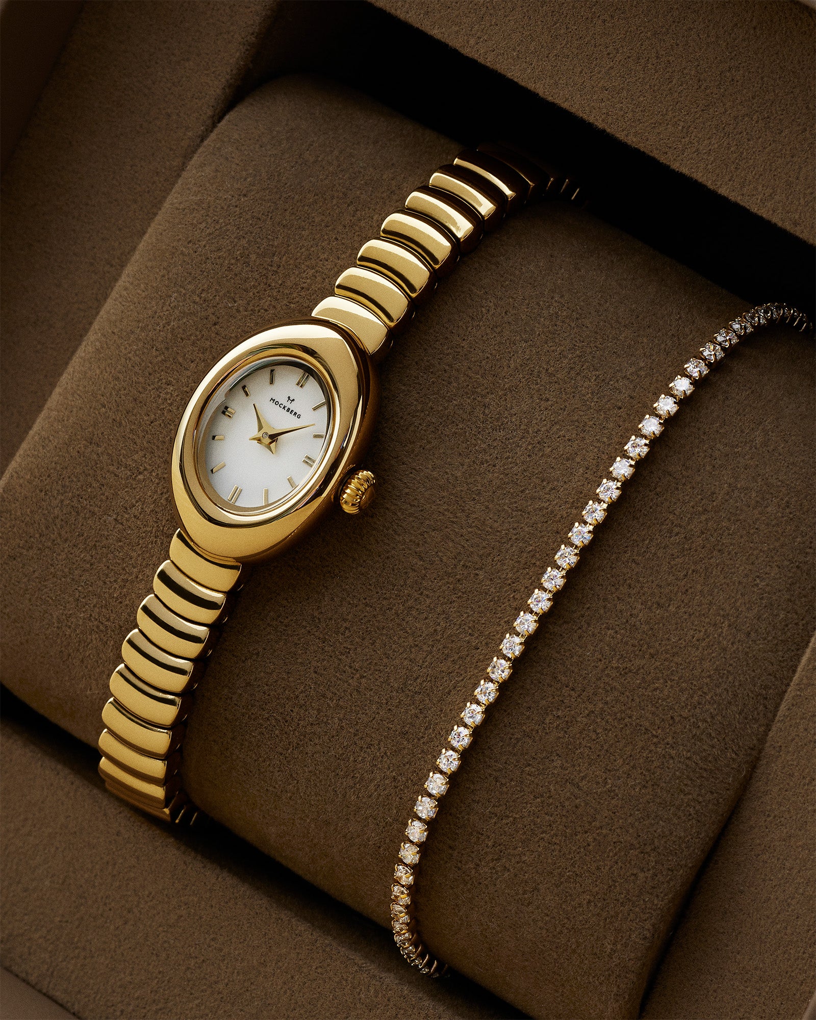 Mockbergs gåvoset med Belle Oval Petite-klocka och armband ger en klassisk, sammanhållen look som passar både vardag och fest. Kombinationen är lätt att bära och lyfter din stil utan att ta över. Klockan och armbandet levereras tillsammans i en presentask.