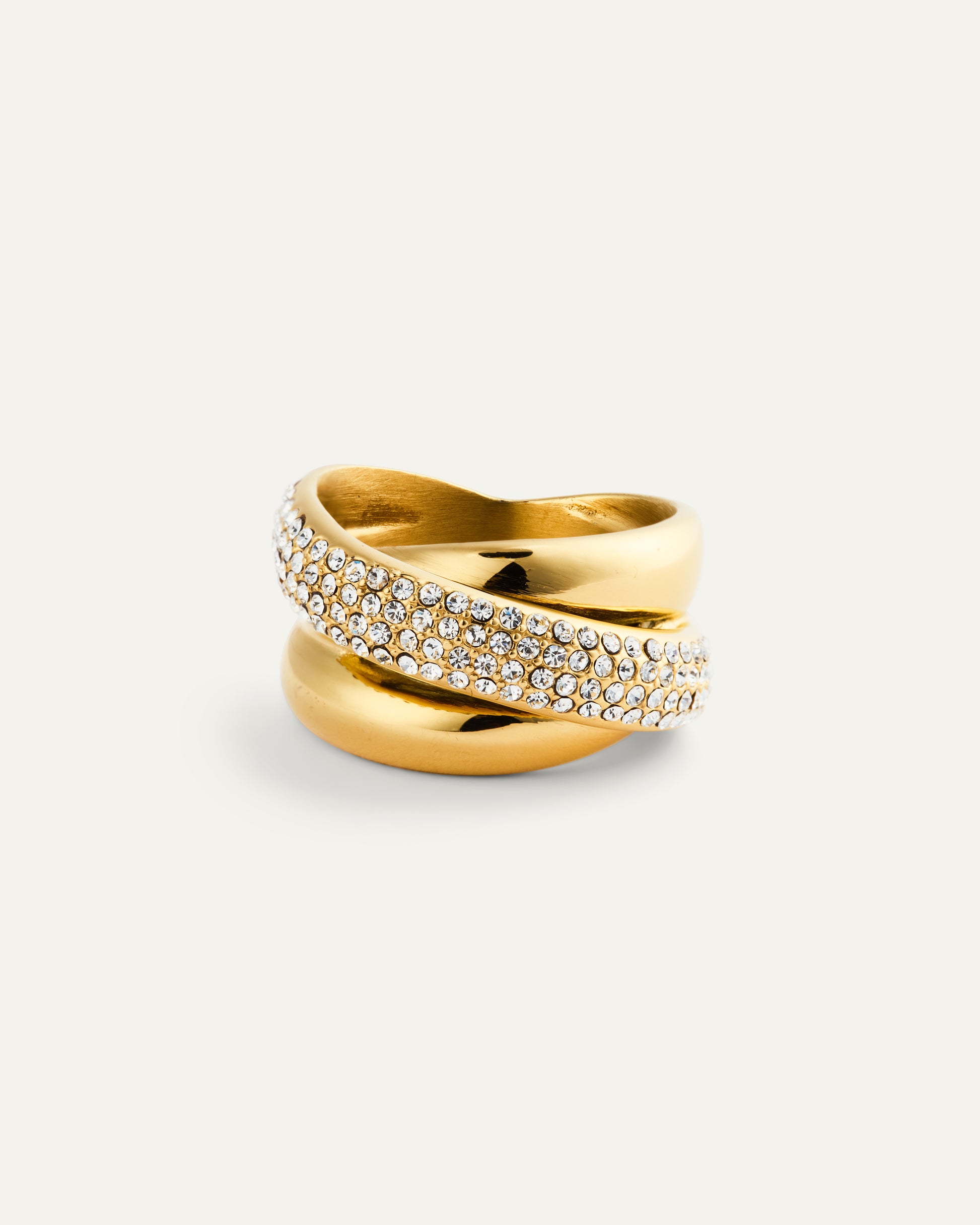 Varm glans med tvinnad form och tätt satta vita Preciosa-stenar som fångar ljuset fint. Guldfärgen ger närvaro utan att ta över – ett litet statement du gärna bär varje dag. Passar lika bra ensam som i stack.