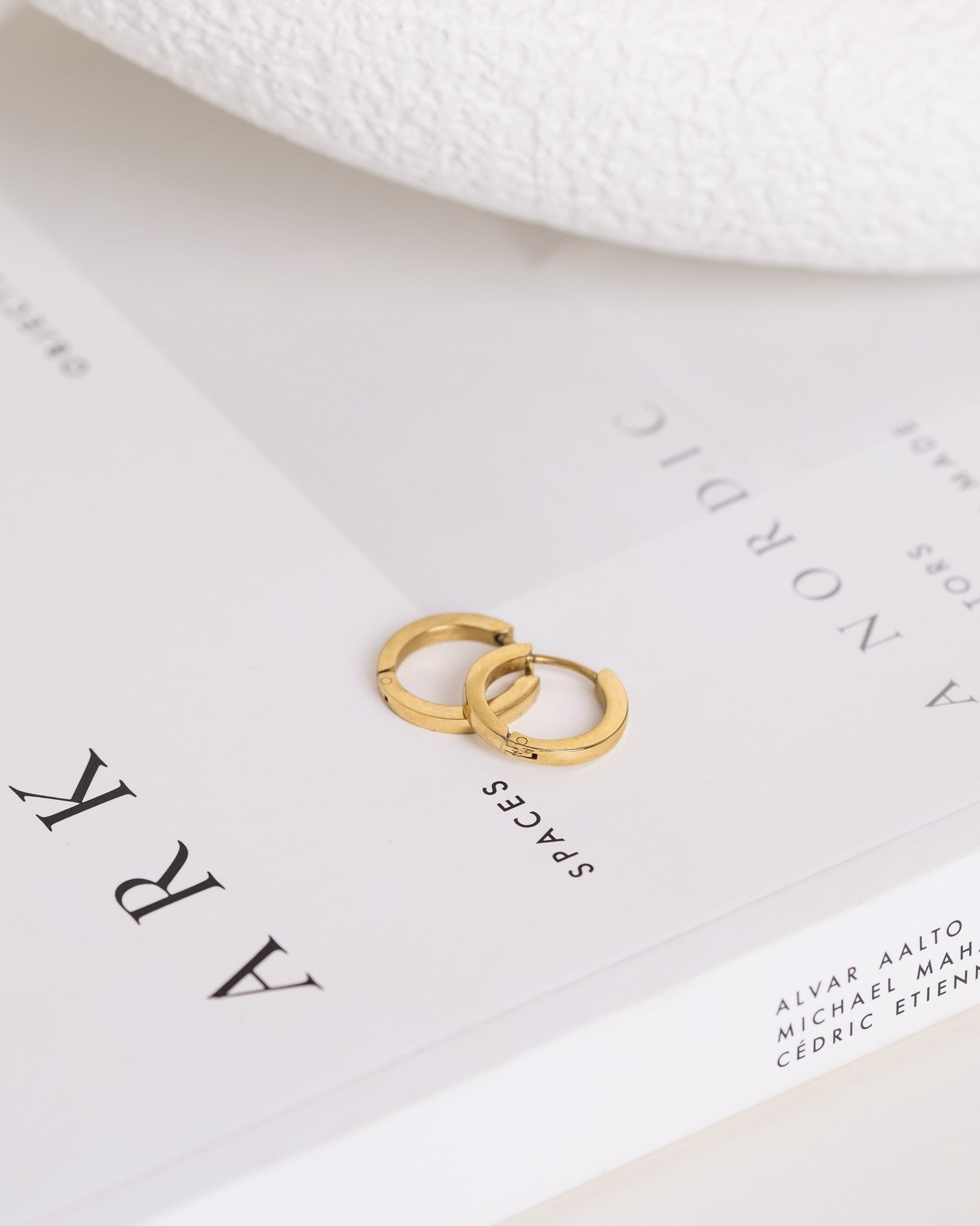Klassiska hoops med klicklås, tillverkade i massivt rostfritt stål och 18K guld PVD-plätering. Slitstarka och vattentåliga, dessa örhängen behåller sin färg och elegans över tid. Passar utmärkt ihop med våra Shiny Hoops.