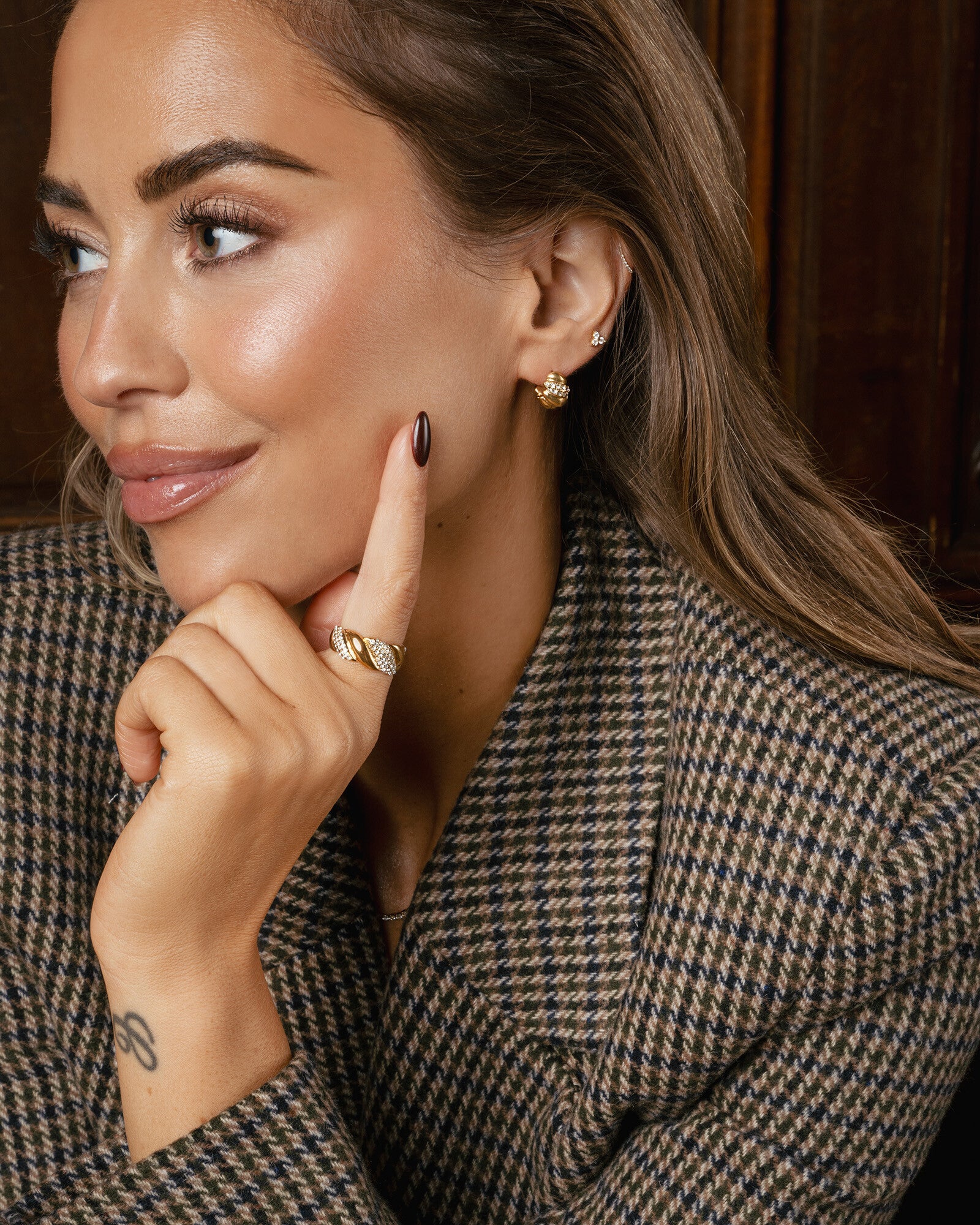 Varm glans och tvinnad form med vita Preciosa-stenar som fångar ljuset fint. Ett par som ger närvaro utan att ta över – lika bra solo som i lager.