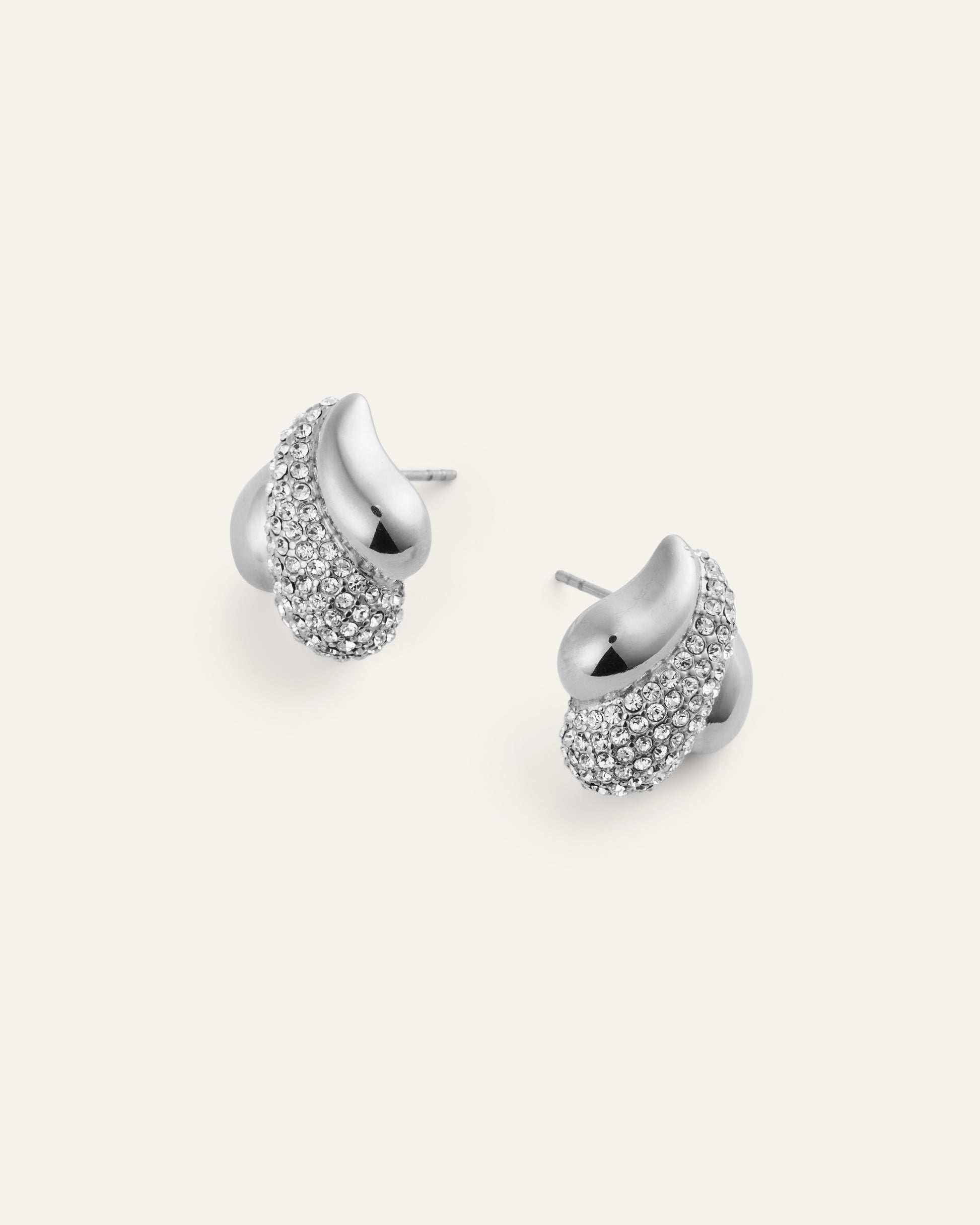 Skulpterad form med mjuka svep och tätt satta vita Preciosa-stenar som fångar ljuset. Silverfärgen ger ett tydligt uttryck som fungerar från vardag till kväll.