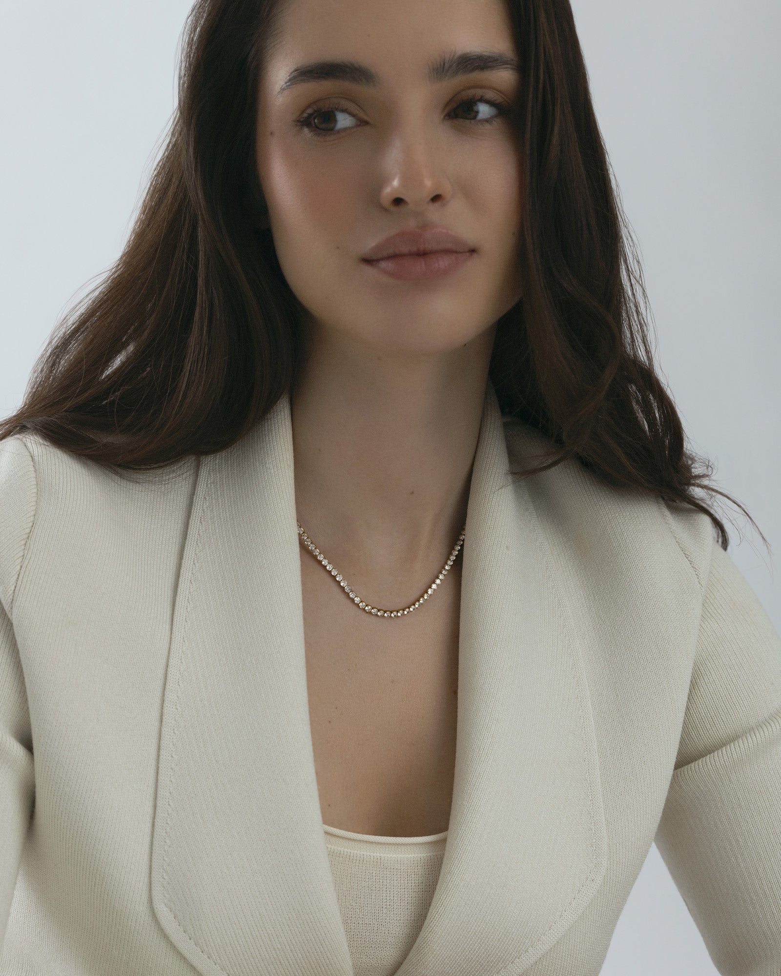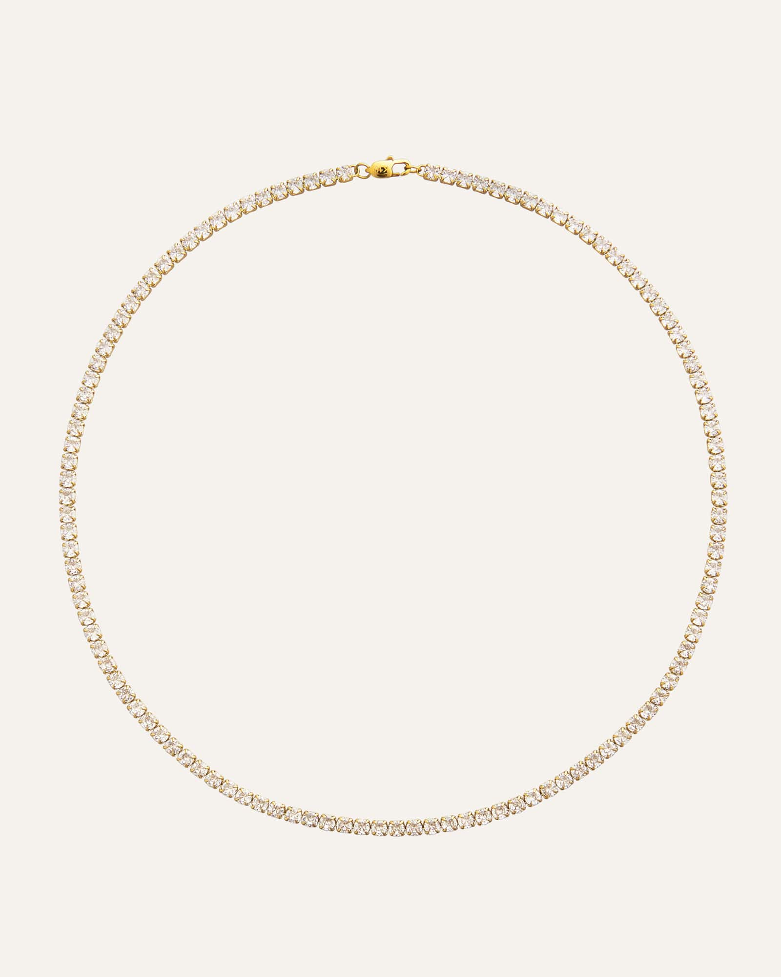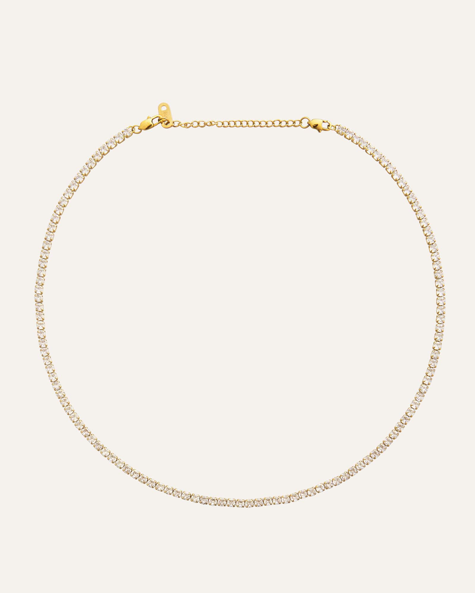 Tennis Necklace är ett halsband designat med gnistrande Cubic Zirconia-stenar som löper längs hela kedjan. Tillverkat i rostfritt stål med 18K guld PVD-plätering är det både slitstarkt och vattentåligt, vilket gör att det behåller sin färg och glans över tid.