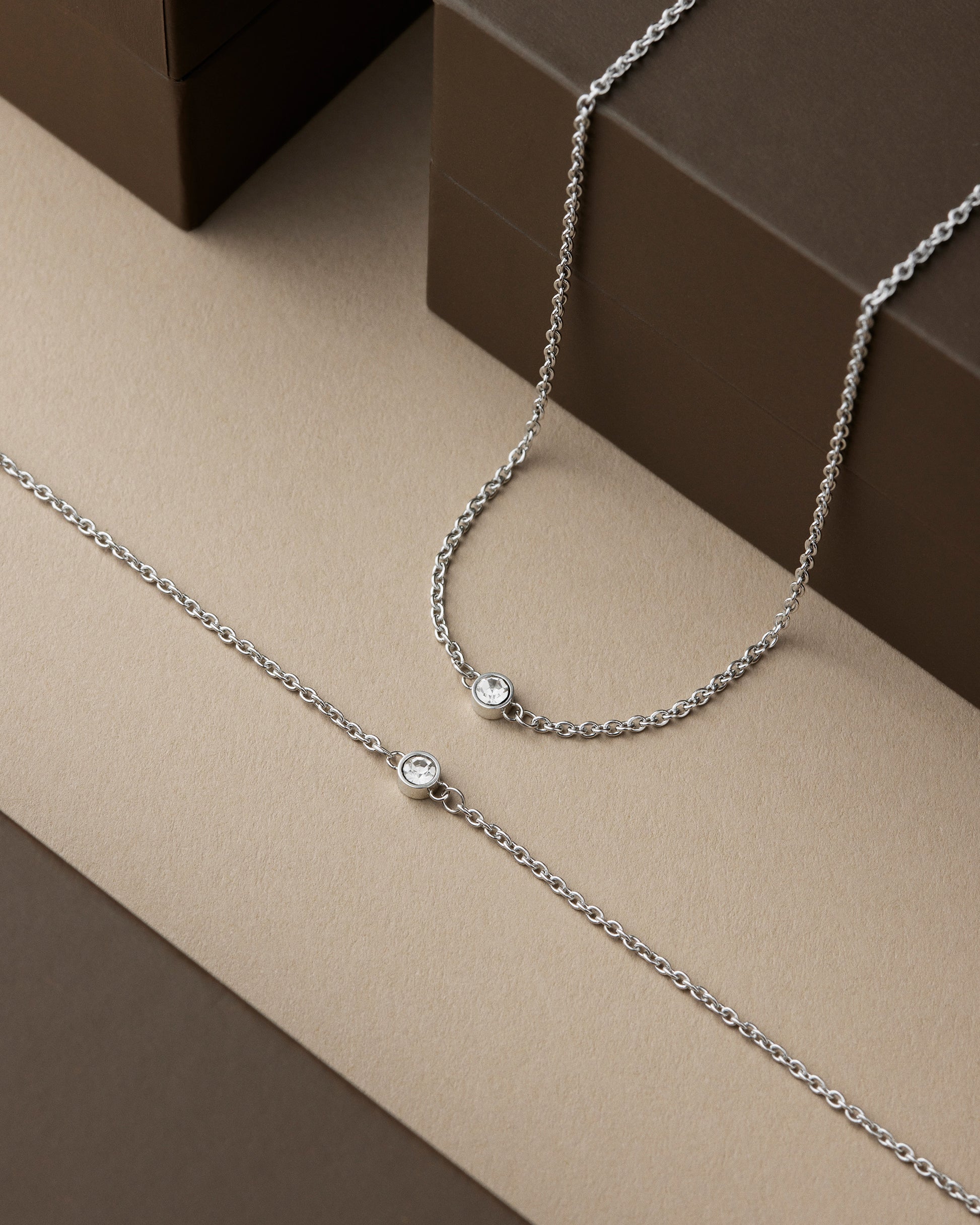 Svalt skimmer i två delar. Thin Diamond i silverfärg ramar in handled och hals med en ren, tidlös känsla där den infattade stenen fångar ljuset diskret. Lätt att styla, lätt att tycka om – varje dag.