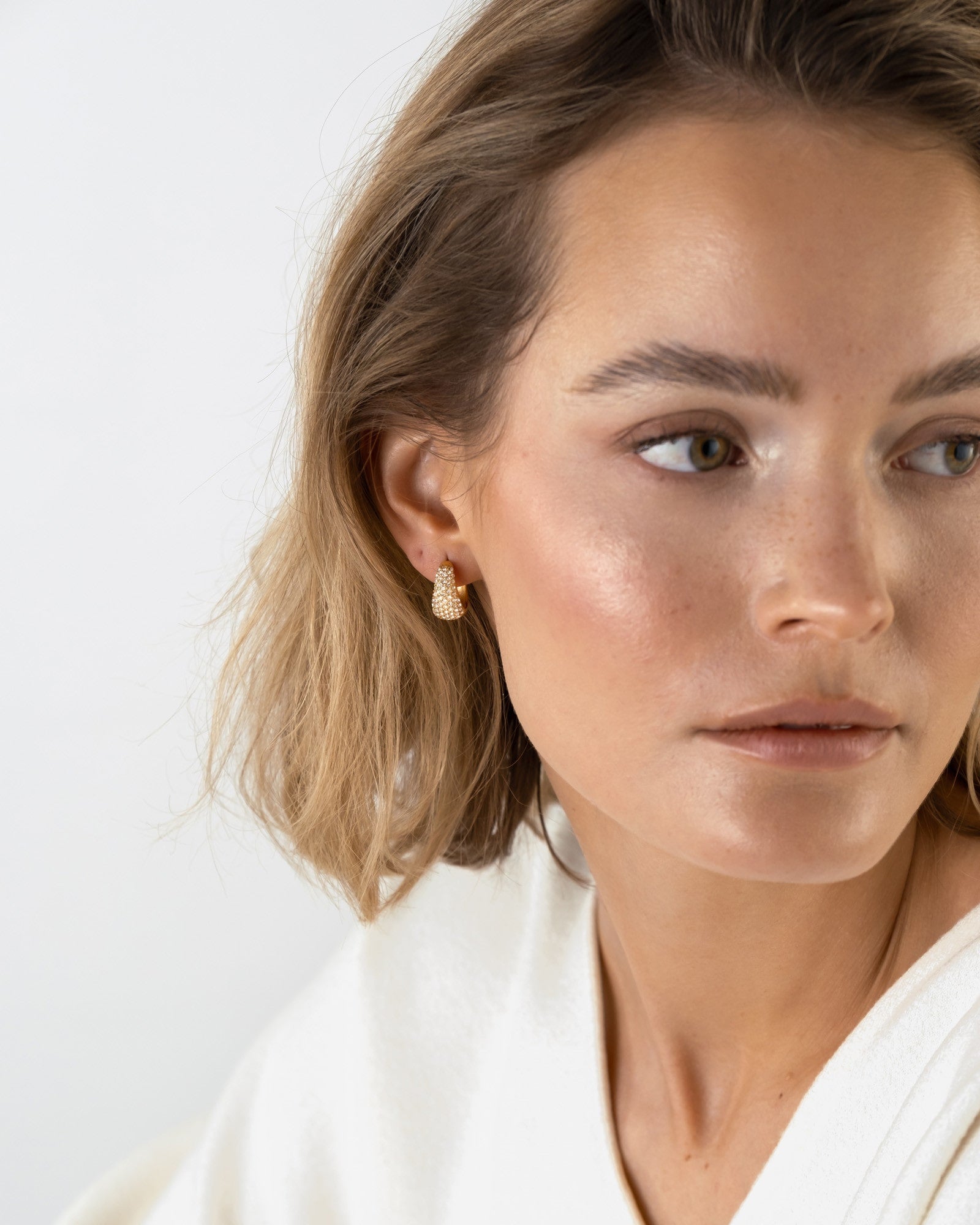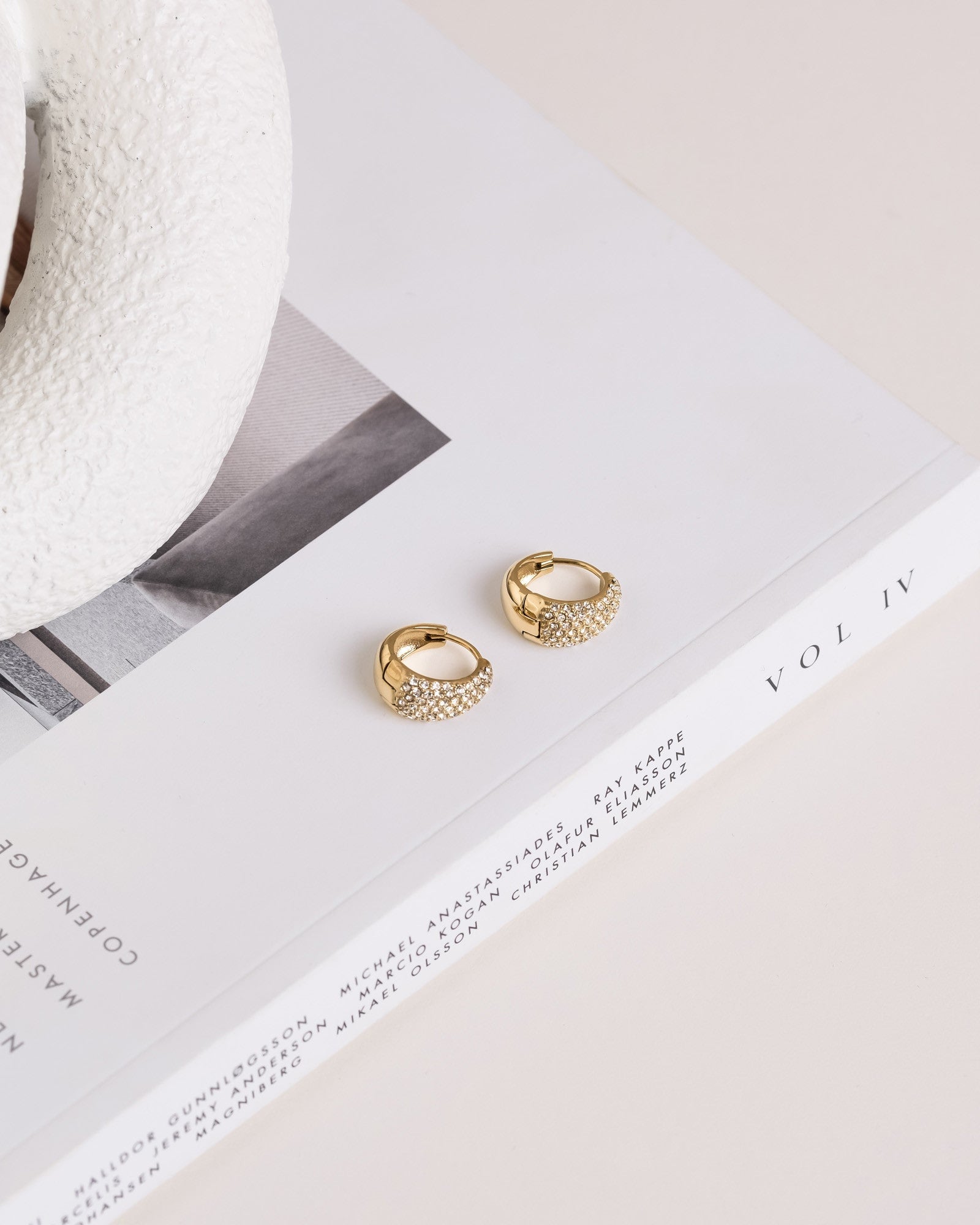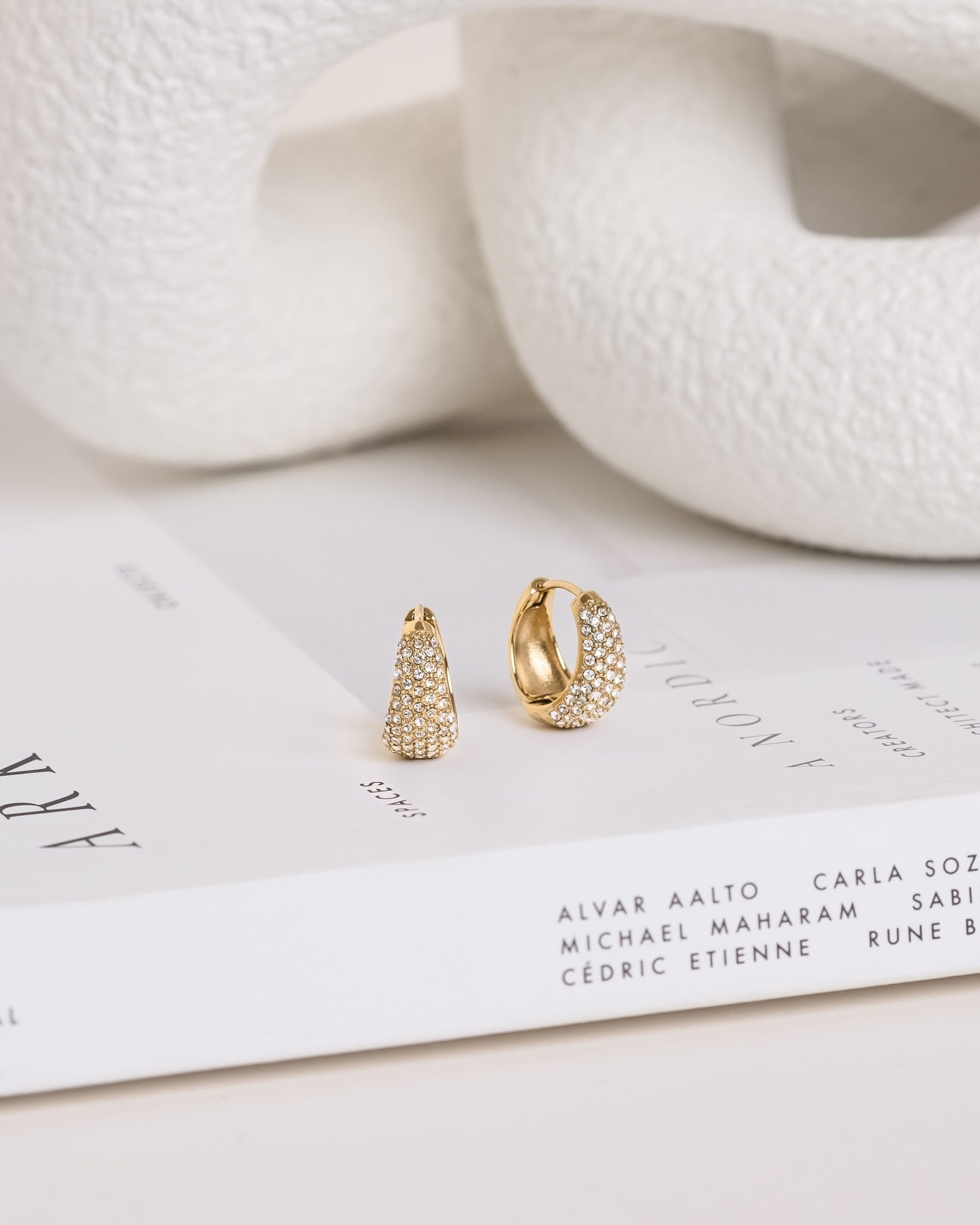 Hoop-örhängen med Cubic zirconia-stenar, designade för att ge din look en tidlös och modern elegans. Tillverkade i massivt rostfritt stål med 18K guld PVD-plätering, de är både slitstarka och vattentåliga, vilket gör att de behåller sin färg över tid.